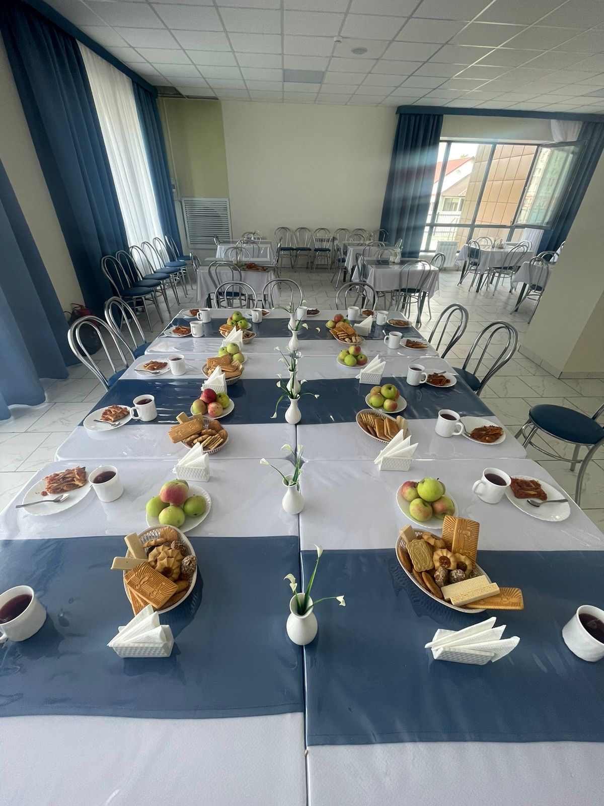 На столах как всегда вкусняшки, пирог испеченный нашими поварами и яблоки с нашего сада! Песни, частушки и конечно теплые поздравления друг другу!