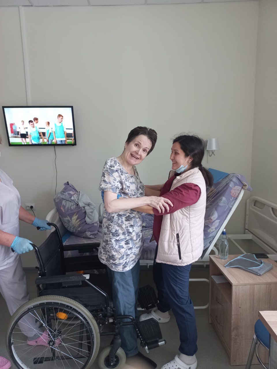 У медицинского персонала Центра активного долголетия и инструктора по ЛФК — новые достижения — наша подопечная Ольга, еще недавно прикованная к постели, теперь самостоятельно питается в столовой вместе с другими проживающими!