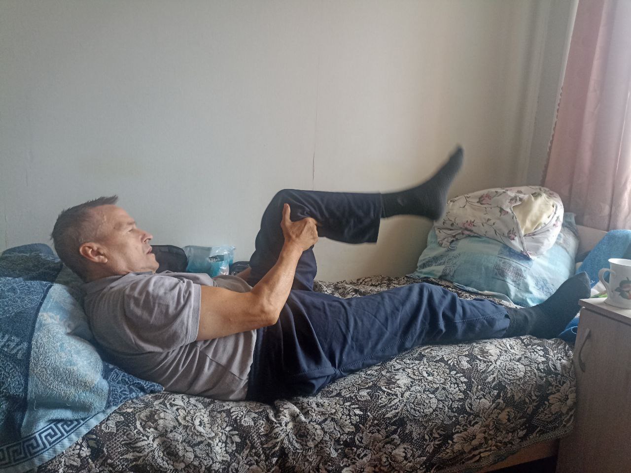 Галина и Николай Семенович делают дыхательную гимнастику, прорабатывая специальные мышцы. А Валерий — разрабатывает левый тазобедренный сустав.