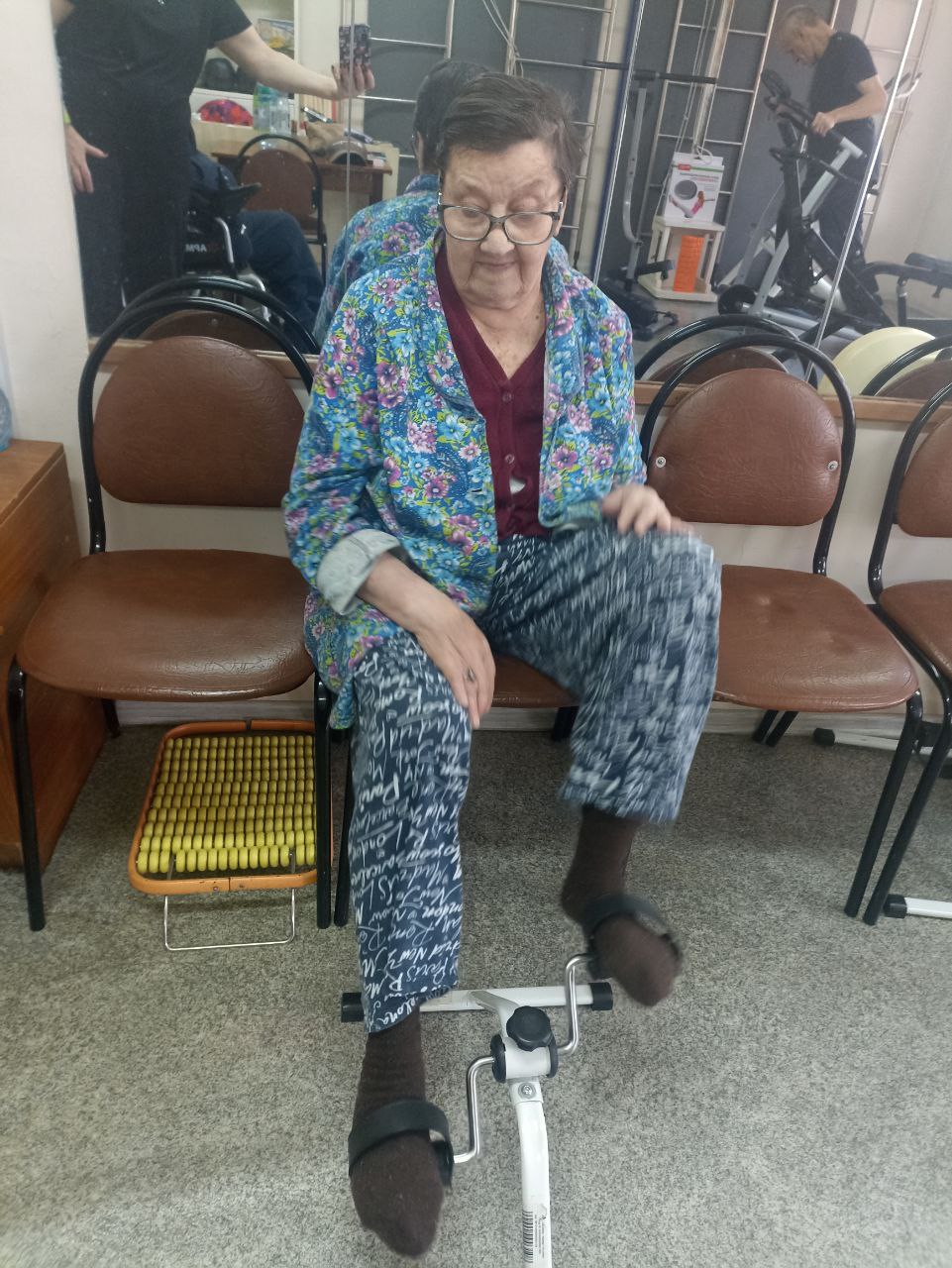 Занятия с Валерием Викторовичем уже дают свои результаты — после перелома шейки бедра он с трудом передвигался на ходунках, теперь преодолевает с ними достаточно длинные расстояния.