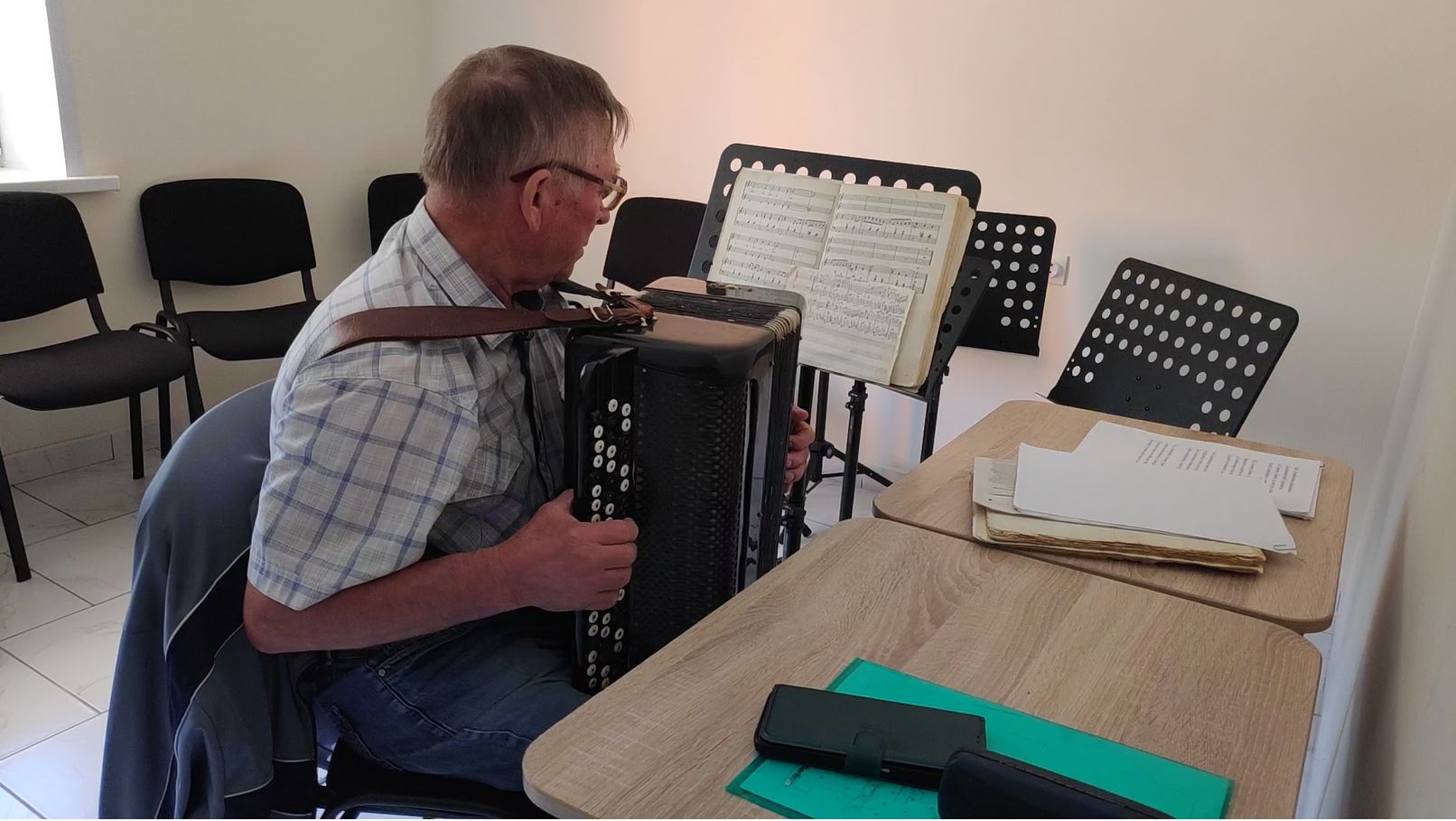 Перед началом музыкального занятия руководитель музыкального класса Григорий Яковлевич тихо настраивает аккордеон — проверяет клавиши, расправляется с мехами, разминает пальцы.