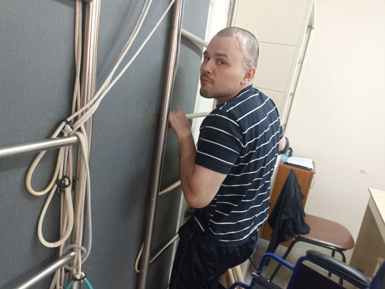 Даже тем, кого привозят на инвалидной коляске доступны множество упражнений. Сегодня подопечный инструктора по ЛФК Татьяны Филипповой тренировался с мячом, гантелями и поднимался с коляски по шведской стенке.