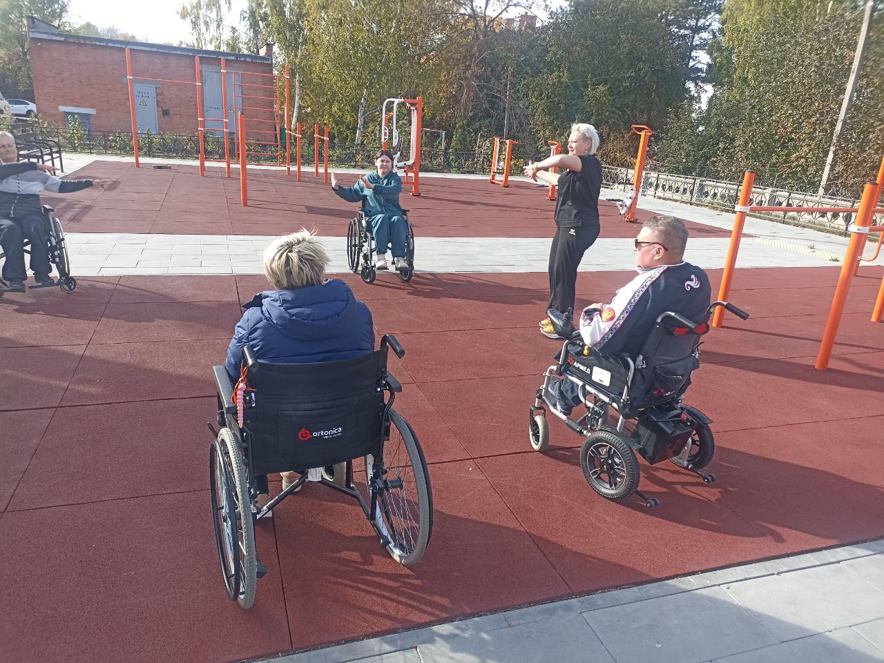 Продолжаем регулярные занятия по ЛФК. Сегодня — теплая погода и групповые занятия по лечебной физкультуре проходят на открытой спортплощадке. На занятии — инвалиды-колясочники. Танцевальные упражнения для рук — дают работу всем мышцам верхней части тела: спины, груди, живота и плечевого пояса.