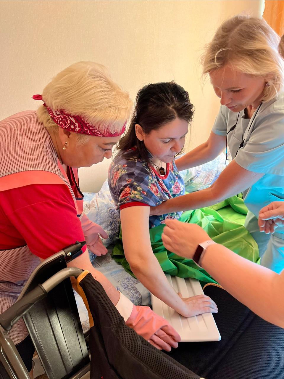 В школе ухода участники осваивают навыки, необходимые для ухода за пожилыми людьми и инвалидами, в том числе навыки перемещения и позиционирования. Они учатся правильно профилактировать пролежни, а также использовать технические средства реабилитации.